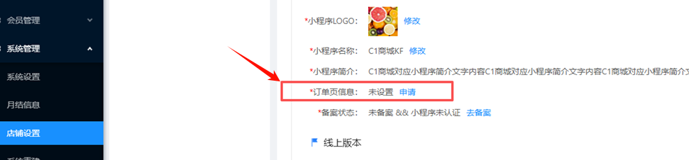 提交备案信息时,由于各地审核要求存在差异,【小程序订单中心path设置】项不一定为必填。用户可以先不做填写,看直接提交能否通过;也可以通过C1后台点击【店铺设置-小程序设置-订单页信息-申请】,将path信息通过接口自动回写。