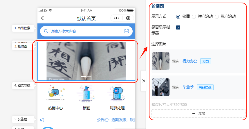 以轮播图为例,添加组件后点击组件进行参数设置:选择展示方式、上传图片(宽高比保持750:300为最佳)、设置图片跳转对象等。