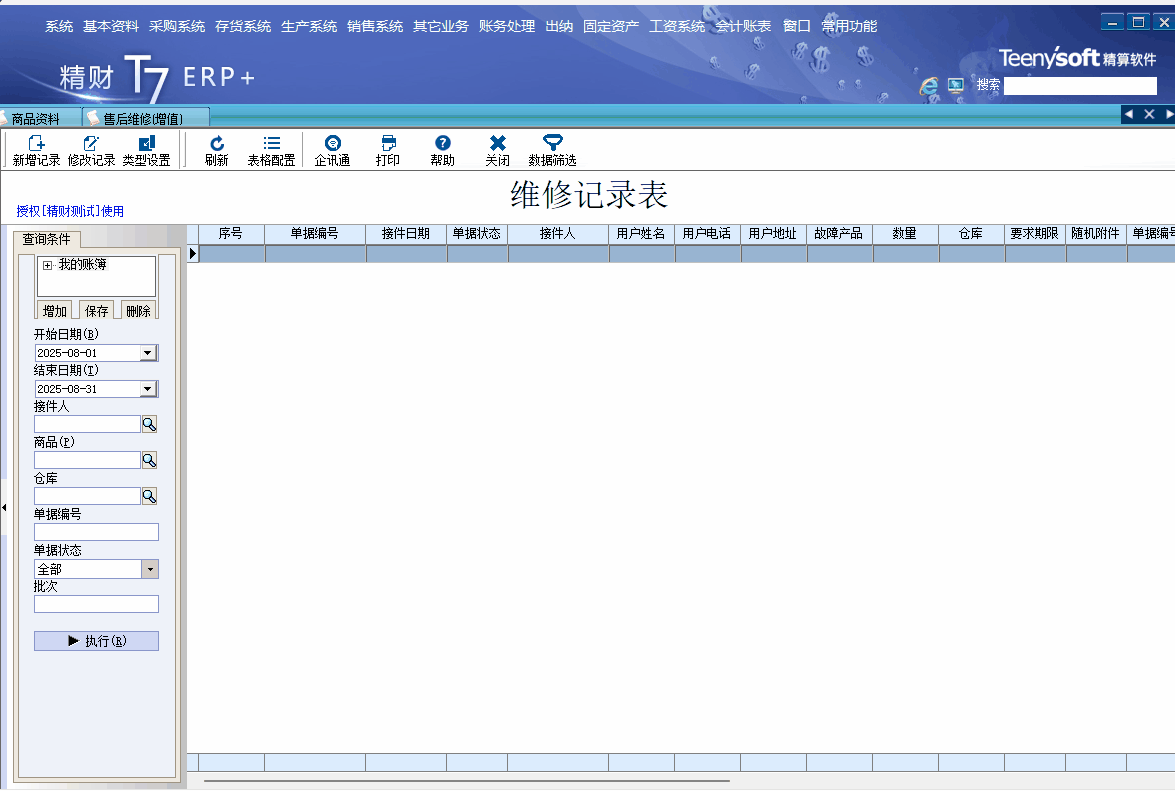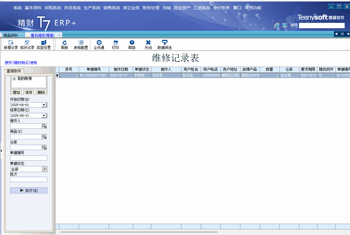 企业经营过程中,通常会出现少量的产品,销售出去后由于使用不当或者产品质量问题需要进行维修或保养,涉及维保的处理过程在本企业内部就可以处理,不用退回厂家.针对这类客户场景,精财项目推出售后维修模块,对维修接件信息记录,成品配件领用,维修,完成过程记录及成品配件库存,成本变化,保修自费情况进行有效管理