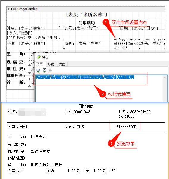 可以 需要实现电话号码隐藏显示的效果,需要在对应字段的内容中进行响应处理。如图: 在打印样式设计界面中,对应手机号码字段使用语句:[Copy(<表头."手机">,1,3)]****[Copy(<表头."手机">,8,4)]