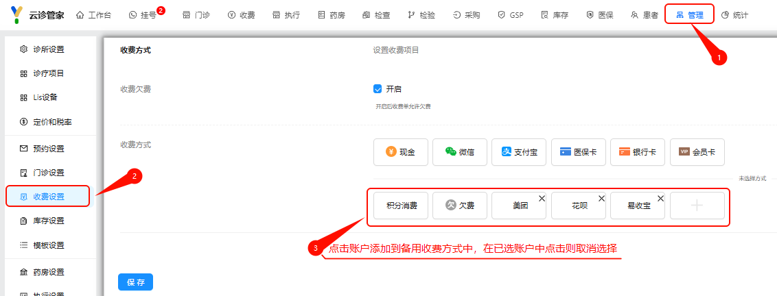 点击【管理】-【收费设置】-【收费方式】,点击彩色账户按钮进行取消,点击灰色账户按钮进行收费方式的添加。