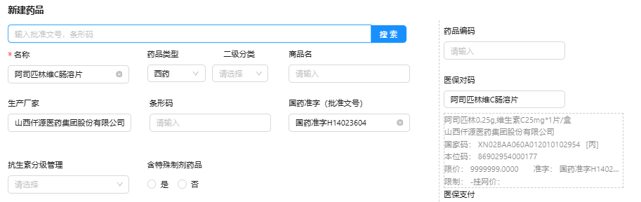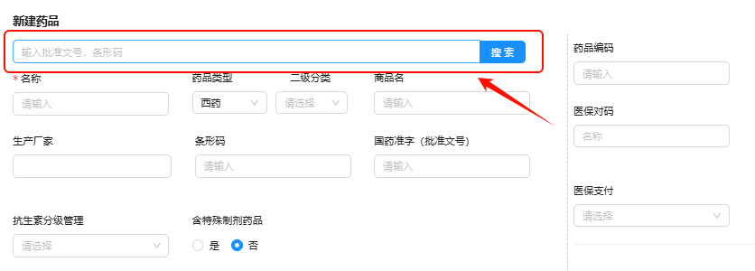 在云诊管佳软件中,用户可以在新建资料的界面【顶部】直接通过名称、条码、国药准字或追溯码快速定位药品/商品。