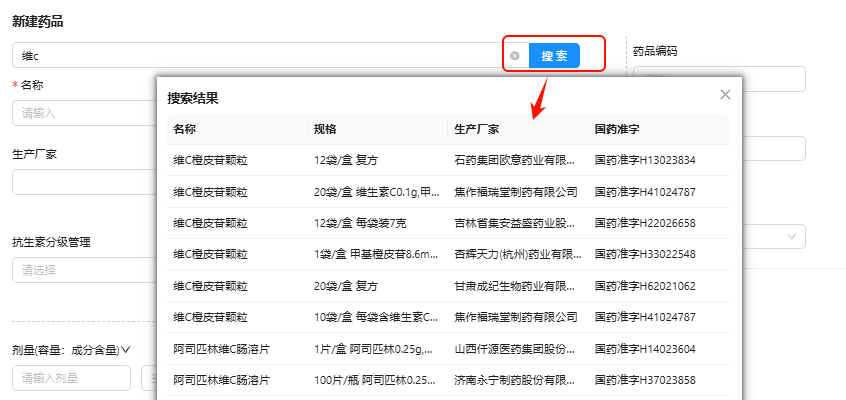 录入名称、条码、国药准字或追溯码后,点击【搜索】。