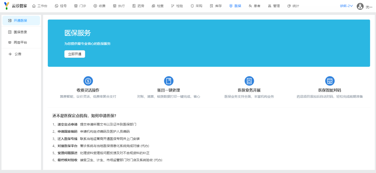 进入【医保】模块,在【医保服务】菜单中点击【立即开通】。