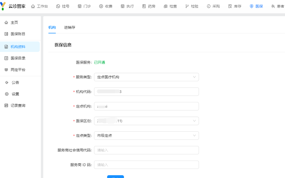 在【医保服务开通】界面,录入诊所相关资料对医保模块功能进行激活。