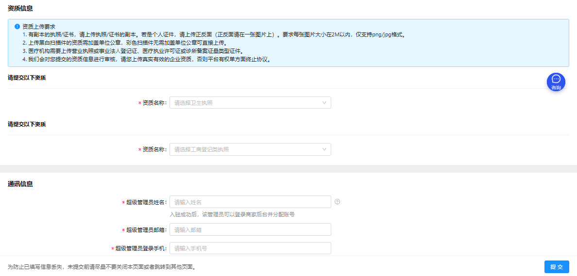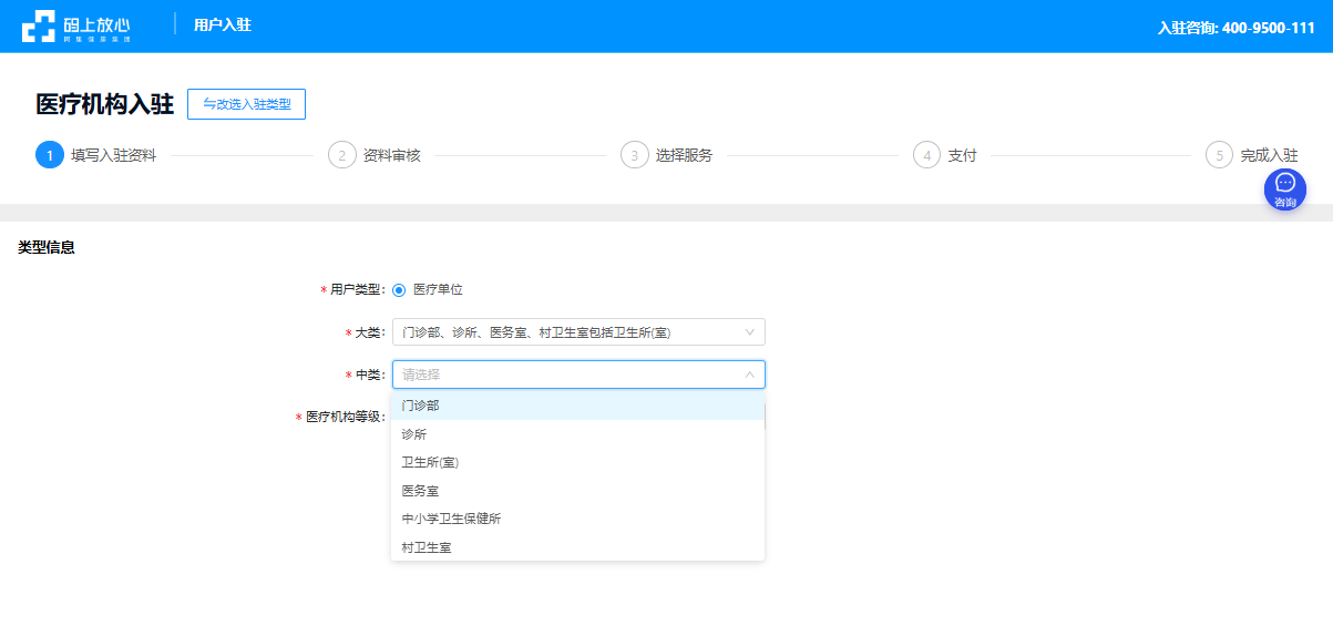 2.1 点击【开始入驻】后,系统默认为用户选择入驻类型为:医疗机构(诊所、医院默认选择该类型即可)