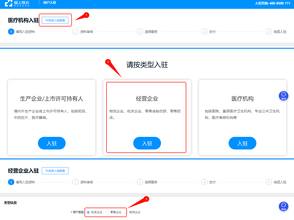 - 操作:点击【改选入驻类型】-【入驻经营企业】-根据自身业务情况选择【用户类型】