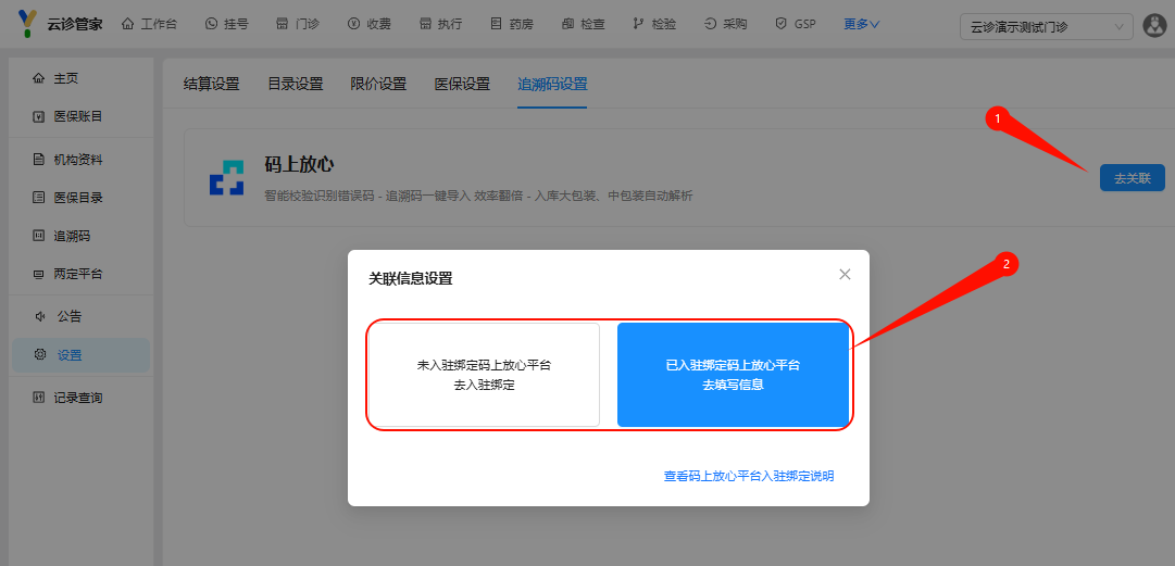 在用户入驻码上放心平台后,实现入驻账号与云诊产品绑定的步骤如下。