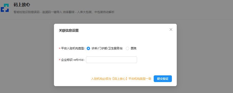 已完成前置操作获取refEntId的客户,直接在相应位置填写对应内容即可提交验证(【平台入驻机构类型】要和入驻码上放心平台时保持一致)