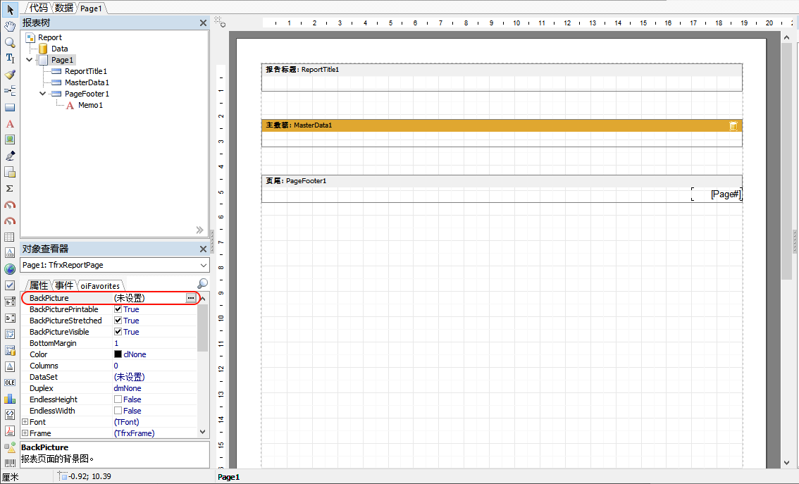 见图:打开设计页面,点击【属性】-【BlackPicture】参数,选择需要添加的背景图即可。