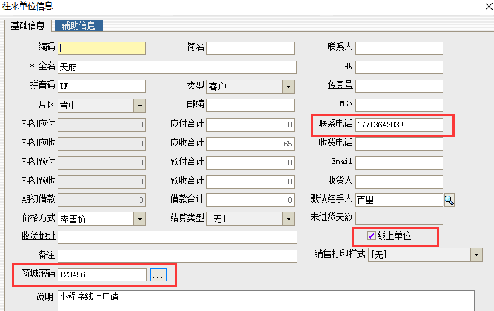 往来单位联系电话即客户登录的账号,ERP管理人员可以对账号密码进行设置。